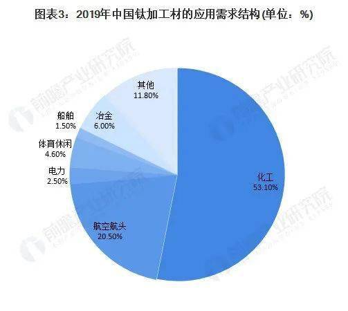 在我國鈦材的需求結構中,鈦加工材料主要應用于化工領域,與全球相比最主要的差別在航空領域,全球范圍內航空用鈦材始終占據鈦材總需求的53%左右,而國內航空航天用鈦材的比例僅為20%,說明我國航空用鈦材市場還存在較大潛力。
