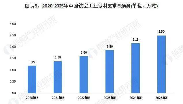 3、國內高端鈦合金市場呈“雙寡頭”競爭格局 在國內鈦合金市場中,目前能夠批量生產軍用航空鈦合金棒絲材的企業主要是:西部超導、寶鈦股份和湖南金天鈦業科技有限公司。 4、航空航天用鈦材需求前景廣闊 2009-2017年,中國航空航天用鈦材銷量的年復合增長率為16%,同時考慮到國內目前航空航天用鈦材占比遠低于全球范圍內航空航天用鈦材占鈦材總需求的50%的比例,假設未來幾年年的復合增長率保持不變,至2025年,我國航空工業鈦材需求量將達2.5萬噸。