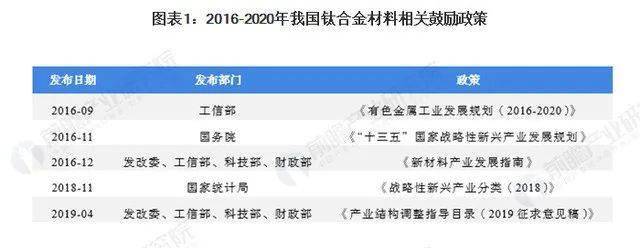 鈦合金指的是多種用鈦與其他金屬制成的合金金屬,近年來,我國頻頻發布政策鼓勵鈦合金材料的研發、生產及應用。在全球市場中,鈦合金材料主要應用于航空工業、國防軍工以及其他工業。其中,在航空工業的應用需求最大,約占50%,主要是用于飛機和發動機的制造。在我國鈦材的需求結構中,鈦加工材料主要應用于化工領域,而國內航空航天用鈦材的比例僅為20%,說明我國航空用鈦材市場還存在較大潛力。目前,在高端鈦合金領域,我國能夠批量生產軍用航空鈦合金棒絲材的企業較少,呈“雙寡頭”的競爭格局。 1、政策鼓勵鈦合金材料的發展 鈦合金指的是多種用鈦與其他金屬制成的合金金屬。世界上許多國家都認識到鈦合金材料的重要性,相繼對其進行研究開發,并得到了實際應用。近年來,我國也頻頻發布政策鼓勵鈦合金材料的研發、生產及應用。2019年,據《產業結構調整指導目錄(2019征求意見稿)》披露的信息顯示,將高性能超細、超粗、復合結構硬質合金材料及深加工產品、低模量鈦合金材料、耐蝕鈦合金材料、航空航天用鈦合金緊固件等列為產業結構調整鼓勵類項目。