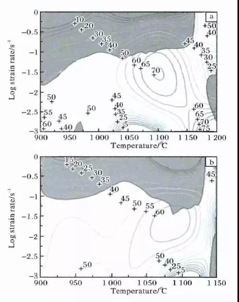 圖2 TB12 阻燃鈦合金擠壓棒材照片 Fig. 2 Photo of extruded TB12 fireproof titanium alloy bar 圖3 TF550 阻燃鈦合金的熱加工圖( ε = 0. 4) Fig. 3 Processing maps of TF550 fireproof titanium alloy ( ε = 0. 4) : ( a) as-cast; ( b) as-extruded