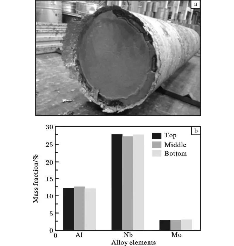 目前的解決方法主要是優選中間合金和優化混布料工藝。圖1 為北京航空材料研究院采用真空自耗熔煉工藝制備的TD3 鈦合金3 t 鑄錠(
