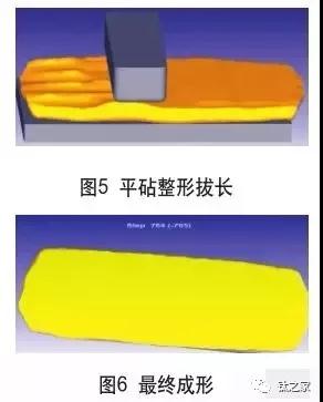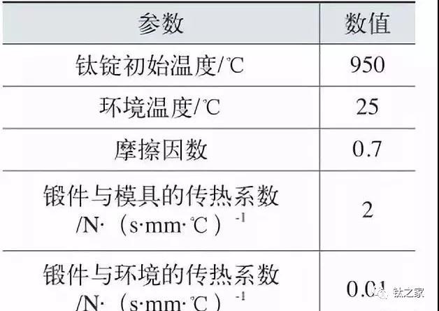 針對某公司鈦板坯鍛件,材料為TA2,要求成形尺寸2050+15 (寬)×260(高)±10× L(隨長)(m m),原材料鈦錠經過表面加工去除表 面 缺 陷 及 取 樣 后 , 尺 寸 為φ990mm×2600mm。成形寬度尺寸/原材料截面尺寸≈2.07,超過一倍尺寸。根據傳統經驗公式計算,要保證最終展寬成形 尺 寸 原 始 坯 料 截 面 直 徑 需≥ φ 1450mm。 常 規 成 形 工 藝 為 鈦 錠 先鐓 粗 , 保 證 鐓 粗 后 截 面 尺 寸≥ φ 1450mm后再進行平砧間拔長展寬。鍛造過程由于TA2的材料特性,容易造成鐓粗過程中面折疊缺陷,為防止折疊過深,需分多道次進行鐓粗,出現折疊現象后立即進行輕滾圓拔長后再進行鐓粗,嚴重影響鍛造效率及鍛造質量。采取直接拔長的方式進行展寬,在試驗前通過有限元數值模擬分析軟件對試制方案進行分析,最終通過實際生產驗證工藝方案的可行性。 1.工藝方案 鍛造工藝路線:芯棒展寬→換專用芯棒繼續展寬→上下平砧成形修整,選用50MN快鍛壓力機進行整個鍛造工序。具體過程為:將鈦合金錠平放在大平板上,上端采用 φ 630mm芯棒分兩次進行壓扁,總壓下量控制在300mm左右,左右移動芯棒進行展寬至坯料高度約為550mm。為防止芯棒展寬過程中出現板坯料中間尺寸偏大,兩端偏小的情況,特制專用芯棒進行進一步展寬,展寬至寬度約為2000mm,高度約為440mm。最 后 采 用 特 制 上 平砧 ( 7 0 0 m m 砧 寬 , 砧 長2300mm)、下平板進行拔長及整形。 2.工藝的數值模擬 (1)模型建立及參數設定采用SolidWorks軟件上對鈦合金錠、芯棒、特制芯棒、下平板、上下平砧進行三維建模,并導入有限元模擬軟件中。TA2材料屬性由數據庫中已有的模型導入,由于采用快鍛壓力機,設定正常開啟5臺泵的上砧平均壓下速度下限約為50mm/s。采用六面體網格對鈦錠模型進行網格劃分,為保證模擬的準確性,設定網格數量32000個。數值模擬的其他參數如附表所示。 利用數值模擬形成的工藝參數,在生產實際中進行試驗,圖7為最終鍛造成形的TA2板坯,試驗過程中在厚度約為265mm時,展寬最寬點達到2150mm,與優化后仿真結果非常接近。且兩端頭舌頭長度僅約50mm,低于常規鈦板成形的舌頭長度150~250mm。最終通過加工后材料利用率達到91.6%,高于常規的鈦板成形利用率約2%,符合最終成形的質量要求。 ![]() |