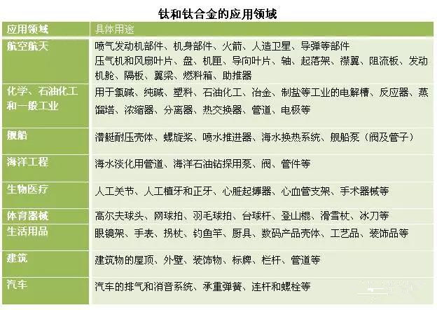 汽車使用鈦的優點有:減輕重量,降低燃料消耗;改善動力傳輸效果,降低噪音;減少振動,減輕部件載荷;提高車的持久性及環境保護。 醫療行業 鈦在醫療領域有著廣泛的應用。鈦與人體骨骼接近,對人體組織具有良好的生物相容性、無毒副作用。人體植入物是與人的生命和健康密切相關的特殊的功能材料。同其它金屬材料相比較,使用鈦及鈦合金的優勢主要有以下幾點:1 質輕;2 彈性模量低;3無磁性;4 無毒性;5 抗腐蝕性;6 強度高、韌性好。外科植入物中的鈦合金用量正以每年5%-7%的速度增長。采用鈦及鈦合金制造的股骨頭、髖關節、肱骨、顱骨、膝關節、肘關節、肩關節、掌指關節、頜骨以及心辨膜、腎辨膜、血管擴張器、夾板、假體、緊固螺釘等上百種金屬件移植到人體中,取得了良好的效果,被醫學界給予了很高的評價。 化工行業 鈦具有優良的耐腐蝕性能、力學性能和工藝性能,被廣泛應用于國民經濟許多部門。特別是在化工生產中,用鈦代替不銹鋼、鎳基合金和其它稀有金屬作為耐腐蝕材料。這對增加產量,提高產品質量,延長設備使用壽命,減少消耗,降低能耗,降低成本,防止污染,改善勞動條件和提高勞動生產率等方面都有十分重要的意義。 鈦金屬已成為化工裝備中主要的防腐蝕材料之一,并在化工裝置中已確立了他的耐腐蝕地位。作為化工設備中的理想材料,鈦也愈來愈引起工程技術人員的重視。 經過多年的推廣,鈦及其合金已作為一種優異的耐腐蝕結構材料在化工生產中得到了廣泛應用。目前鈦設備的應用已從最初的純堿與燒堿工業擴展到氯酸鹽、氯化銨、尿素、有機合成、染料、無機鹽、農藥、合成纖維、化肥、和精細化工等行業,設備種類已從小型、單一化發展到大型、多樣化。 調查結果表明鈦換熱器占57%,鈦陽極占20%,鈦容器占16%,其他占7%。在化學工業中以“兩堿”為主,化工設備中鈦換熱器用量最大。 近年來,我國鈦材的生產技術提高迅速,航空航天用鈦,軍事用鈦,汽車用鈦等增長都很迅速,尤其是航空航天領域,有趕超化工用鈦的趨勢。總體而言,化工用鈦的技術含量小,產品附加值低,化工用鈦比例不可避免會逐步下降。 海洋工程 隨著科學技術的發展和陸地資源日趨枯竭,人類開發利用海洋已經提到日程上來了。鈦對于海水有優異的耐蝕性能,大量運用于海水淡化、艦船、海洋熱能開發和海底資源開采等領域。 早在20世紀60年代,我國就已經開始了對鈦及鈦合金在船舶及海洋工程裝備上的應用研究,并做了大量工作,已基本形成了牌號較多、性能各異、品種規格齊全的船用鈦合金體系。由于鈦及鈦合金自身所具備的特性,使其在艦船以及海工裝備的應用上具有得天獨厚的優勢,因而被廣泛應用于核潛艇、深潛器、原子能破冰船、水翼船、氣墊船、掃雷艇以及螺旋槳推進器、海水管路、冷凝器、熱交換器等。 在艦船應用方面,目前我國艦船用鈦量非常少,占船舶總重量的比例不超過1%,艦船及海工裝備用鈦及鈦合金領域發展潛力巨大。此外,在海水淡化以及濱海電站方面,由于我國目前海水淡化以及濱海電站市場需求巨大,在進一步降低鈦合金成本以及提高產品質量穩定性的情況下,鈦的市場應用前景將非常廣闊。 日常生活 鈦在日常生活中的應用非常廣泛,可謂無處不在,例如高爾夫球頭、自行車車架、網球拍、輪椅、眼鏡架等都會應用到鈦。 鈦以其輕質、強度高的特性在體育用品中的應用,從最早的網球拍、羽毛球拍逐步擴展到了高爾夫球頭、球桿以及賽車等。2008年我國體育休閑占總消費量的13%,其中僅高爾夫球頭和球桿的用鈦量就超過了1000噸。鈦合金做成的自行車車架也頗受歡迎,目前有近50價公司生產鈦自行車,美國早已是最大的鈦自行車生產商和消費國。鈦輕質的特點也應用到眼鏡架中,而且鈦又不易與皮膚發生過敏,并且鈦表面經陽極處理可有絢麗色彩,因此從20世紀80年代初就開始應用于鏡架中。